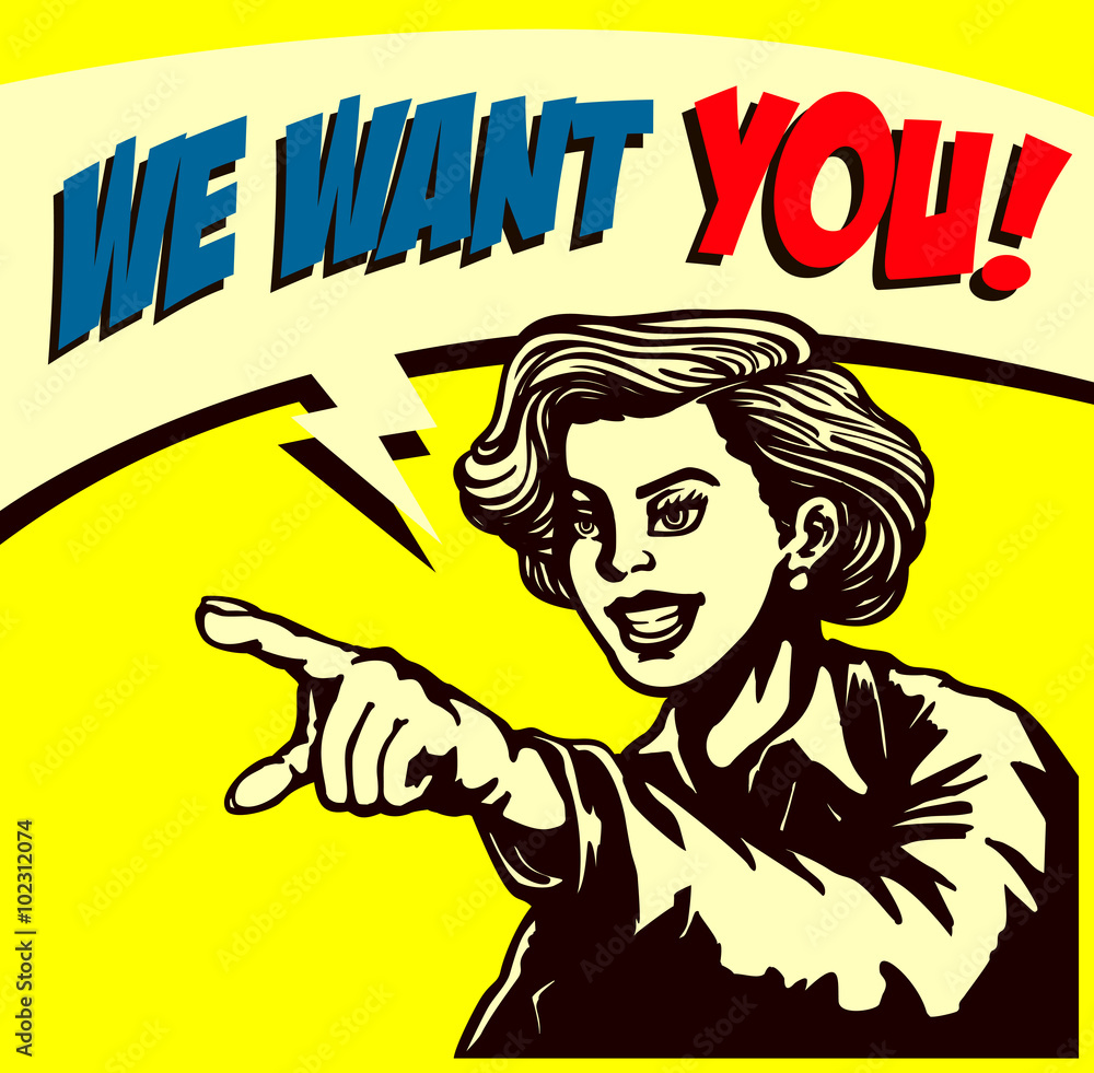 I Want You Retro Businesswoman With Pointing Finger Job Vacancy We Re Hiring Sign Comic Book Style Vector Illustration Join Our Team Stock Vector Adobe Stock